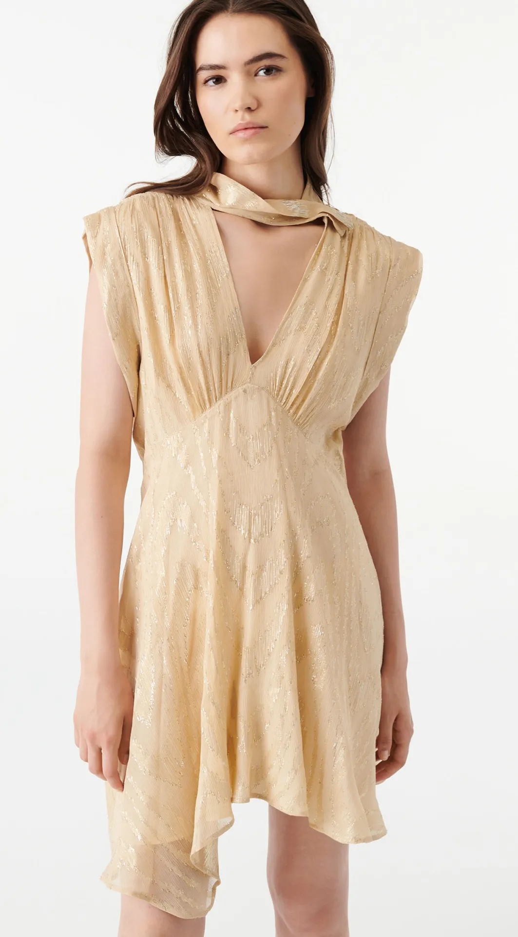 New with tags, no flaws. 80% Silk 20% METALLZED FBER LINING: 100% POLYESTER The IRO Cutout Silk Blend Metallic Fil Coupe Georgette Mini Dress features a v-neck with a cutout detail and a button fastening at the neck. The dress is made from metallic fil coupé georgette silk-blend fabric and has gathered, folded cuffs. It is fully lined and has a non-stretchy, lightweight fabric. The dress is designed to be dry cleaned. The dress is mini length and has a cascade/draped design.