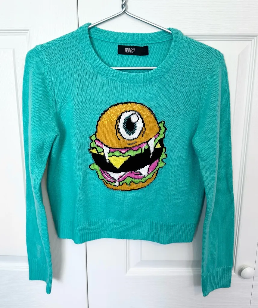 Description: Sink your teeth into this rare Iron Fist “Cyclo Burger” Sweater in vibrant teal — a cul... Show more