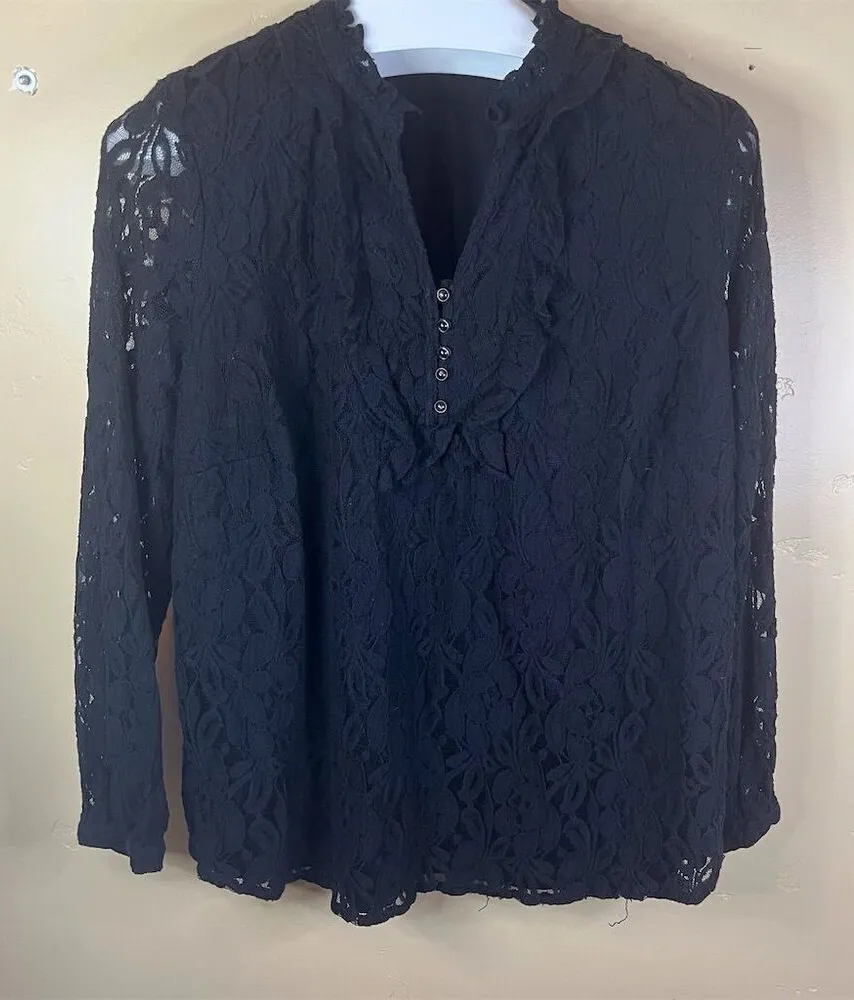 Elevate your everyday style with the Issac Mazari Live Black Lace Blouse. This women's blouse, in a versatile size 1X, is perfect for those casual fall outings. The long sleeves add a touch of sophistication, while the delicate lace material offers a hint of elegance. Button accents provide a charming detail, making this blouse a go-to choice for any casual occasion. Whether you're meeting friends for coffee or enjoying a leisurely day out, this blouse ensures you look effortlessly chic. Brand: Issac Mazari Live Size: 1X Color: Black Type: Blouse Department: Women Material: Lace Sleeve length: Long Sleeve Accents: Button Occasion: Casual Season: Fall Measurements: Chest 19" Length 27" Great Condition. No Stains, Tears, Rips, Holes or Pilling. From a smoke free home and perfume free home. We carefully inspect each item for quality. Tags: Corporate, Work, Career Wear, Business, Business Casual, Interview, Job, Career, office attire, work, professional, polished, mature, sophisticated, business, corporate, careerwear, businesscore, work clothes, dress code, job interview