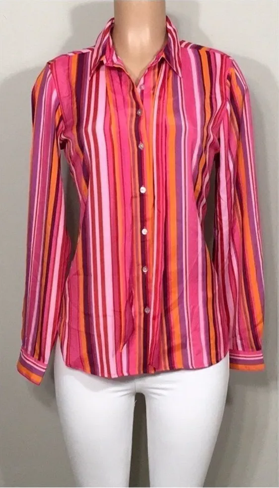 Beautiful stripe shirt in colors of pink, red, purple, orange,. Pearlized buttons. Removable neck ti... Show more