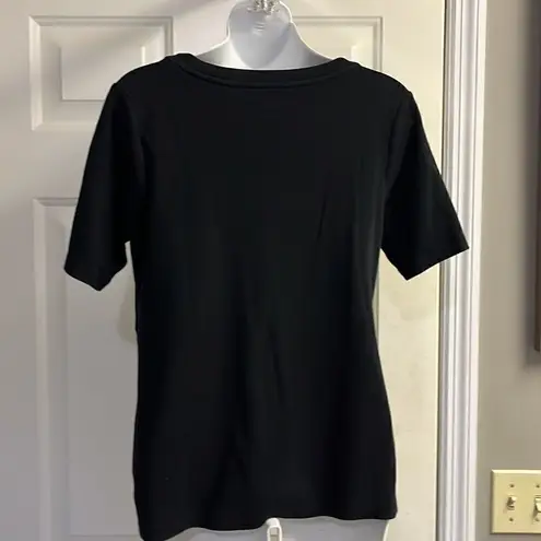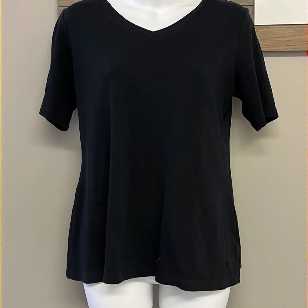 Gently worn, great condition Women’s Size XS (According to department store aizing, so it runs a little larger than 0-2) Black Pima Cotton T-shirt Short sleeves- not quite elbow sleeves Loose fit through torso This shirt has a fit and flare design. Measurements (when flat) Collar to shoulder- approx 8” Shoulder to sleeve- approx 9” Length- approx 24” Armpit to Armpit- approx 19” Care- machine wash cold, tumble low Material- 100% cotton, (80% PIMA)
