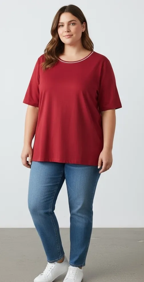 Discover effortless style with this vibrant red knit top from Isaac Mizrahi Live Essentials. Designed for comfort and a flattering silhouette, this top features a classic crew neckline with a subtle contrasting stripe detail, adding a touch of understated sophistication. The short sleeves offer a relaxed fit, perfect for versatile wear. Imagine yourself feeling confident and chic whether you're running errands or enjoying a casual brunch with friends. Measurements: • Pit to Pit: 26 in • Shoulder to Hem: 28 in Type: T-Shirt Department: Women Style: Basic Material: Cotton Blend Neckline: Round Neck Sleeve Length: Short Sleeve Sleeve Type: Casual Sleeve Pattern: Solid Features: Contrasting Trim Fit: Relaxed Fabric Type: Jersey Occasion: Casual Closure: Pullover Season: Spring, Summer, Fall Garment Care: Machine Washable Keywords: Isaac Mizrahi, knit top, crew neck, short sleeve, plus size, red top, essentials, casual wear, everyday, comfortable, versatile, loungewear