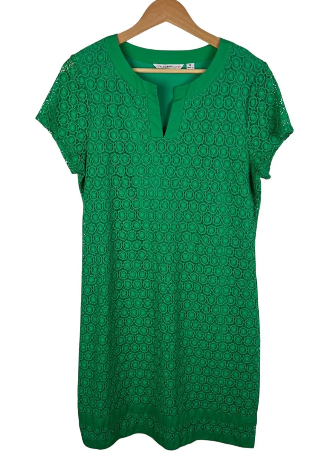 A vibrant green dress that brings a fresh and lively touch to any wardrobe. This striking piece features an intricate crochet knit design, providing a delicate and textured look. A simple v-neckline adds a touch of understated elegance, complementing the dress's overall sophisticated aesthetic. Perfect for a garden party, a casual brunch, or a stylish day out. Style: Shift, A-Line Dress Length: Mini Color: Green Department: Women Sleeve Length: Short Sleeve Pattern: Solid Occasion: Casual, Party/Cocktail Material: Nylon, Polyester, Spandex Neckline: V-Neck Character: Contemporary, Casual, Preppy, Garden Party, Stylish Fabric Type: Knit Season: Spring, Summer Keywords: Isaac Mizrahi, green dress, crochet dress, knit dress, short sleeve dress, womens dress, v-neck dress, casual dress, party dress, spring dress, summer dress, Party Dress, Cocktail Dress, Wedding Guest Dress, Short Sleeve Dress, Eyelet Dress, Stretch Lace Dress, Classic Style, Size Medium Dress Excellent Pre-Owned Condition (see pics for details) Flaws: No visible flaws. Measurements: included in photos. Please compare the measurements to something you already own for a great fit! Fast shipping: Shipped out next business day! Please let us know if you have any questions!