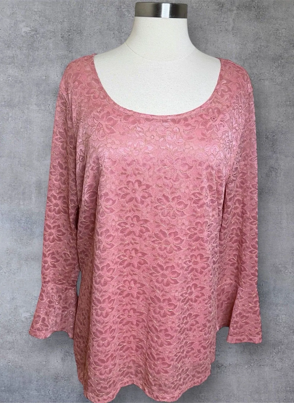 Isaac Mizrahi Live Top XL Pink Floral Lace Built In Tank Sheer Bell Sleeves - $25 - From Laura