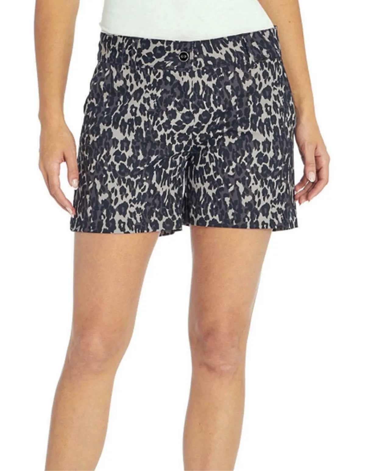 Isaac Mizrahi New York Women's Distressed Leopard Tailored 5" Inseam Short, 8 Have considerable stretch, side slit pockets front and back welt pockets. Button zip front closure. Animal print vacation mob wife stretch dressy casual