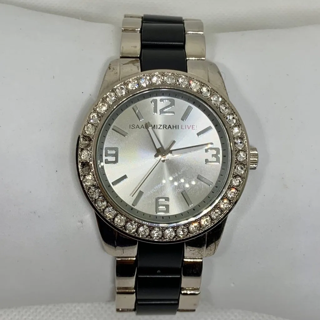 Isaac Mizrahi women watch silver black tone rhinestones 38mm round case quartz analog link bracelet size 7.5” , used condition missing two bezel rhinestones, works good battery installed