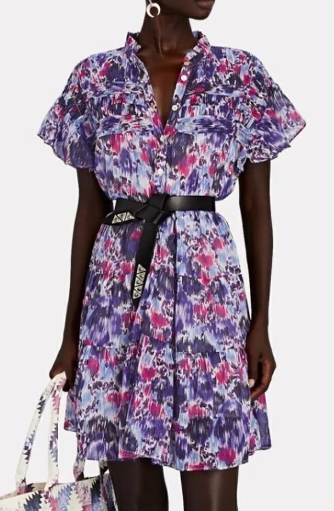 Isabel Marant Etoile Lanikaye Tiered Cotton Mini Dress Sz. 34 (US XS) Retail $495 Fabric is on sheer side, adding a slip might be needed, does not come w/one Measurements Taken: 37"L,19"p/p (across chest) Attention-grabbing in their abstract floral print, pintucks give way to airy cotton gauze tiers on Marant's Lanikaye mini dress. Partial button front closures. Pull-over style. NOTE: Stock photo shoes a belt that is not part of the dress and not included Fabric: 100% cotton Machine wash