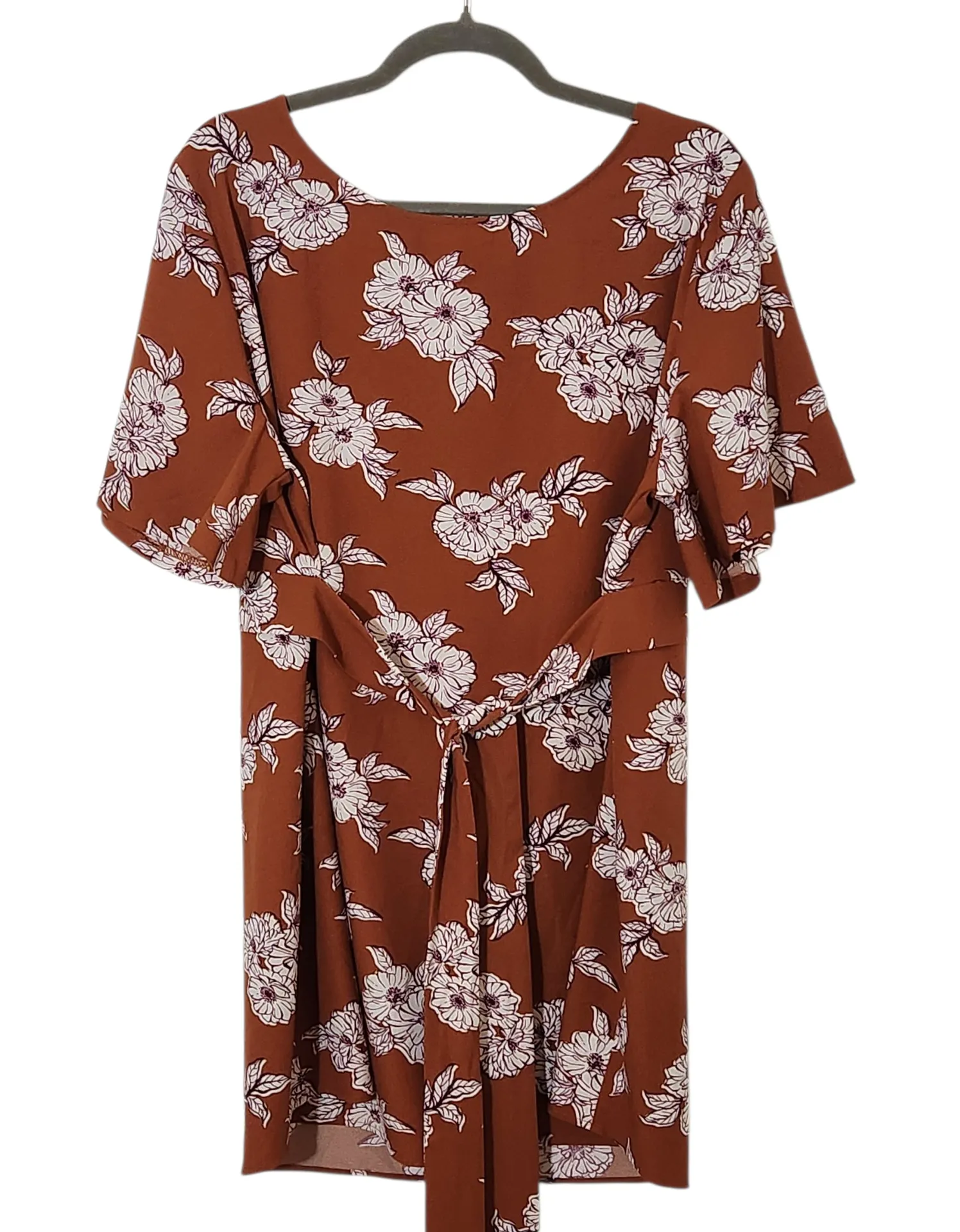 Isabel Maternity brown tunic with a floral pattern with shades of white and purple. Tie at the waist that is attached in the back. Great condition overall, but there is a tiny run in the back near the hem, shown in images. Measurements shown in images and are taken while laying flat. SKU2509-28