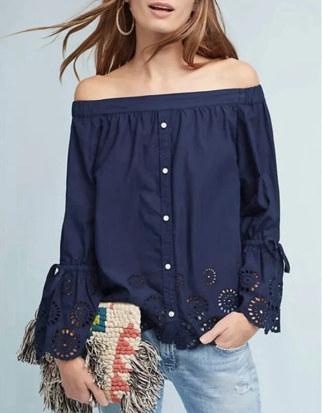 Anthropologie Isabella Sinclair off-the-shoulder eyelet blouse. Navy blue. 100% cotton. Boho, festival, cottagecore. Size small. preowned condition. small detail at the top check the photos