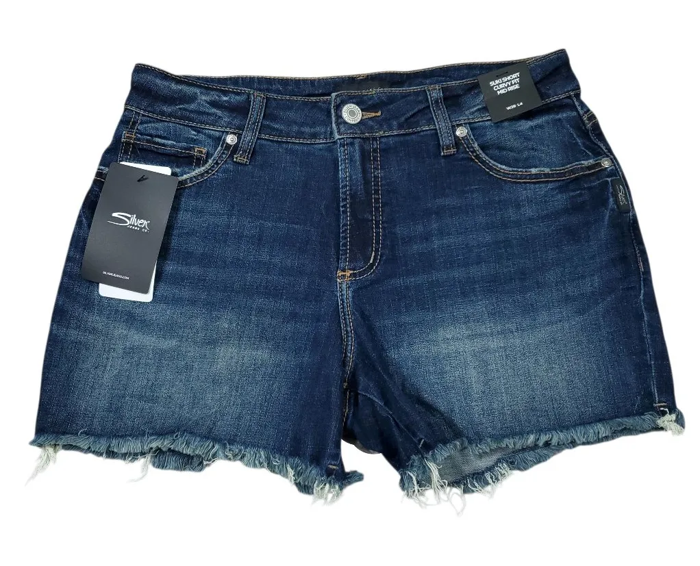 Women's Silver Jeans Co. Suki Curvy Fit Mid Rise Jean Shorts in dark wash blue stretch denim with raw, frayed, or cutoff hem. New with tags. Women's size 29x4", real measurements shown in photos with shorts laid flat: Waist approx 15" Hip approx 19.5" Rise approx 10.25" Inseam approx 4"