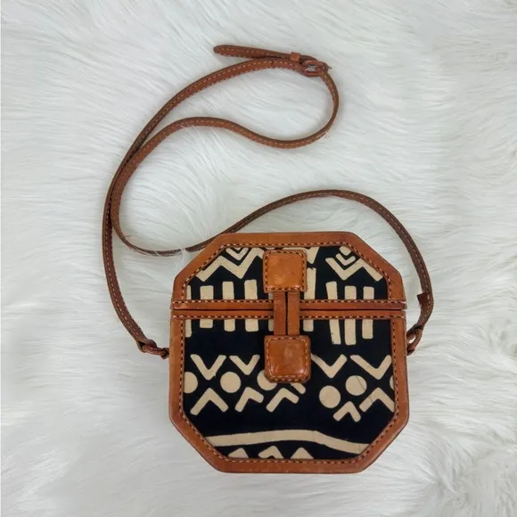 ISLAND IMPORTS Inc Leather & Fabric Crossbody Hard Case Octogonal Handbag Vintage look Octagonal shape 46” Adjustable strap Magnetic snap closure See photos were signed off where. Measurements 7x7x3 Made in Indonesia