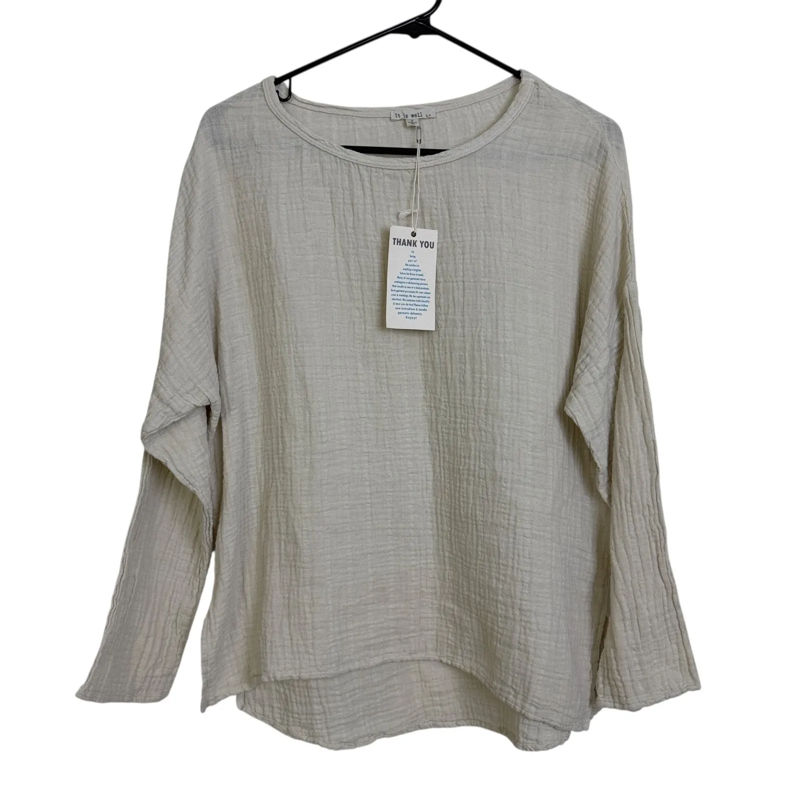 This listing is for a It Is Well LA Women's Textured Gauze Long Sleeve Top. Cream. Lightweight. Slits at the sides. USA Made. Condition, New with tags Approx Measurements Tag Size, Small (Relaxed) Pit to pit, 22in Length, 23-26in