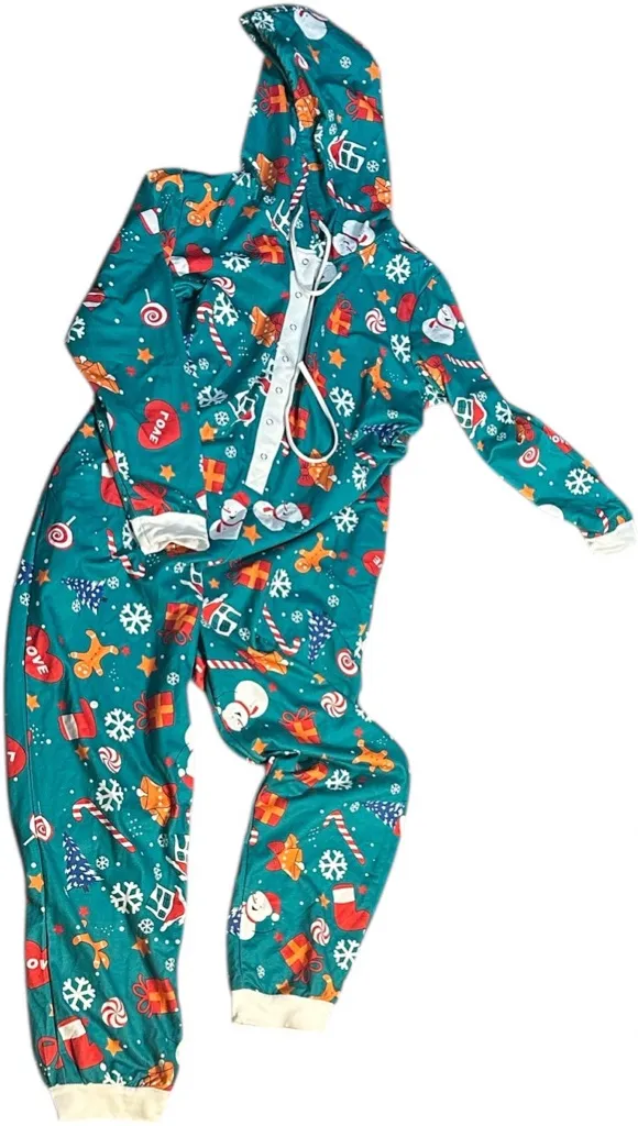 Get into the holiday spirit with this fun and comfy full-body Christmas onesie! 🎄 Features festive prints with snowmen, candy canes, gifts, and gingerbread cookies all over. Made from soft, breathable fabric for ultimate comfort and warmth