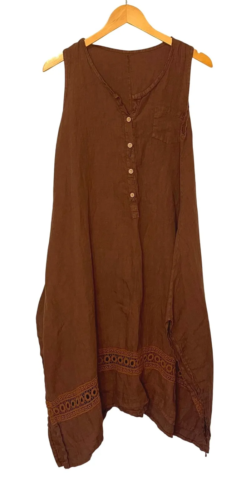 Elegant linen dress that seamlessly blends comfort and style. A sleeveless design provides a breezy and unrestricted feel, ideal for warmer days. The dress features a V neckline, a button down front, and a convenient chest pocket. The beautiful crochet hem adds a touch of sophistication and artisanal flair, making it a standout piece. Made in Italy, this dress showcases premium craftsmanship. Measurements: • Pit to pit: 19 inches • Length: 41 inches Style: Tank Dress, A-Line, Shirt Dress, Sundress, Kaftan Dress Length: Midi Color: Brown/Rust Department: Women Sleeve Length: Sleeveless Pattern: Solid Occasion: Casual, Travel Material: Linen, Flax Neckline: V-Neck Character: Boho Chic, Elegant, Artisan, Italian, Summer Fabric Type: Woven Season: Summer, Spring Keywords: linen dress, sleeveless dress, brown dress, casual dress, summer dress, boho dress, crochet hem, made in italy, midi dress, loose fit, comfortable dress, womens dress