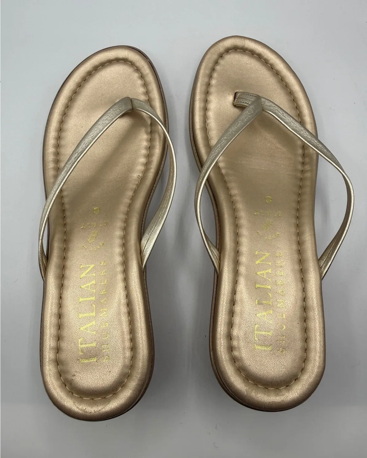 A pair of women's gold metallic flip-flop sandals. These stylish sandals feature a thong strap design and a comfortable flat sole. Made in Italy, they offer a touch of elegance for casual outings or vacation wear. Style: Thong Department: Women Upper Material: Faux Leather UK Shoe Size: 7 AU Shoe Size: 8 Heel Style: Flat EU Shoe Size: 39 Features: Lightweight, Comfort, Straps Closure: Slip On Pattern: Solid Heel Height: Flat (Under 1 in) Type: Sandal Insole Material: Synthetic Outsole Material: Rubber Lining Material: Synthetic Keywords: gold sandals, metallic flip flops, thong sandals, flat sandals, women's footwear, summer shoes, casual sandals, vacation sandals, elegant sandals, Italian made