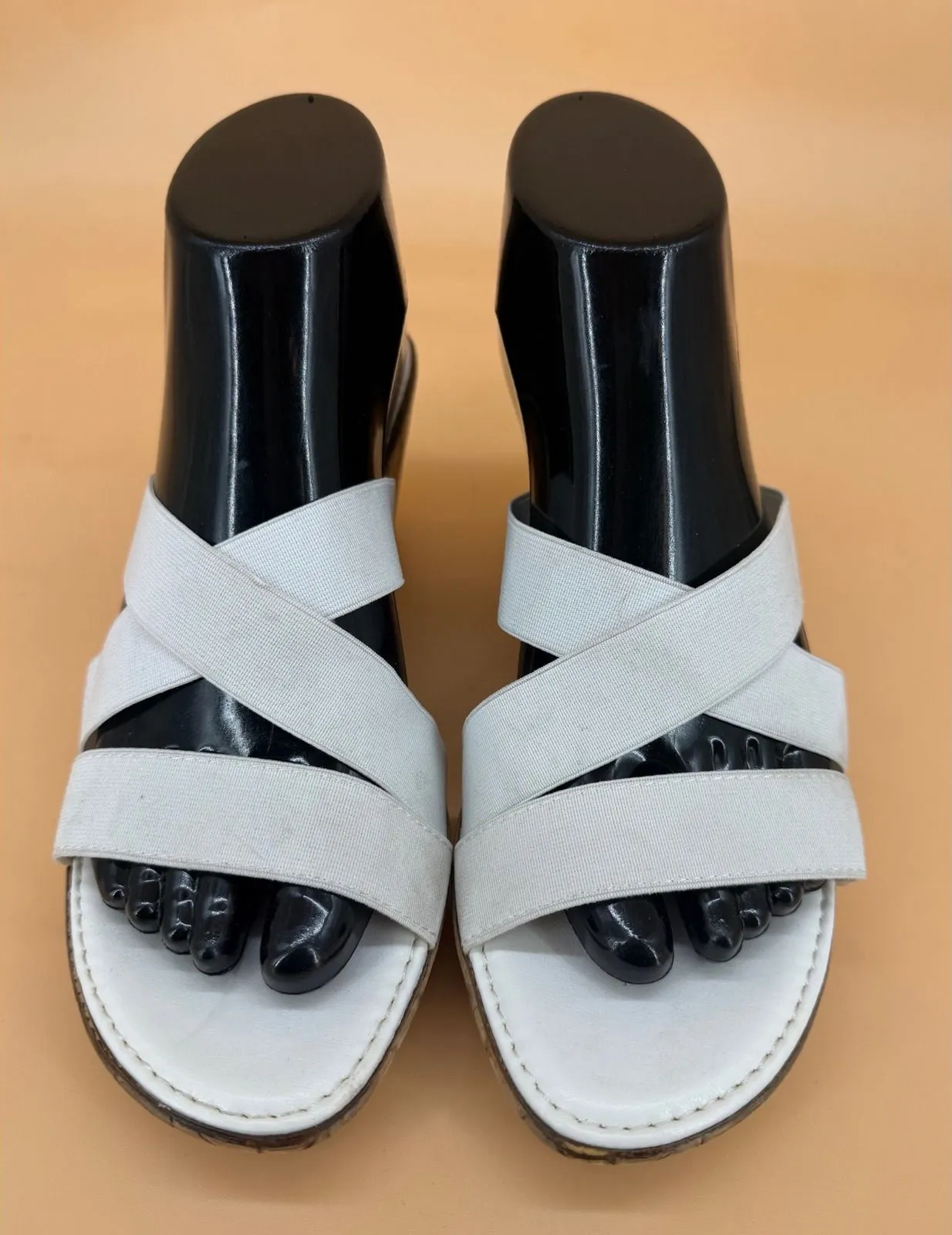 Women's white elastic cross strap wedge sandals. These slip-on sandals feature a comfortable open-to... Show more