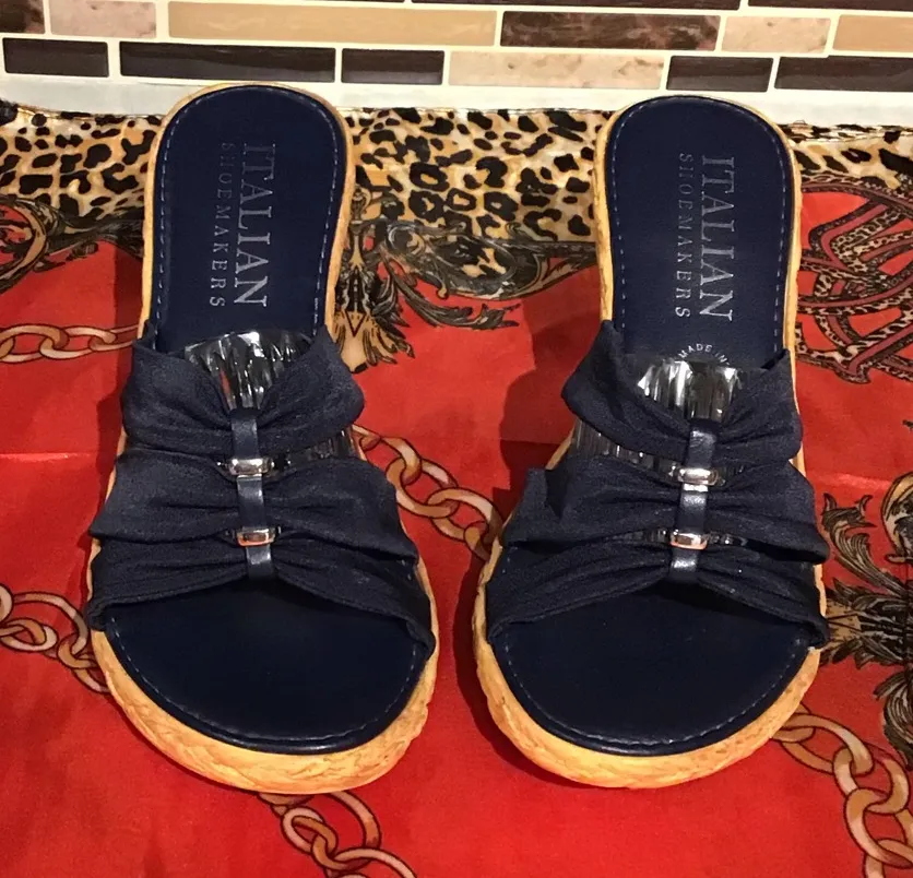 Slip on entry 2.5" heel height Open toe Cushioned footbed Made in Italy Lightweight Faux espadrille Fabric (thin canvas) upper with silver tone metal detail Nice pre-owned condition.