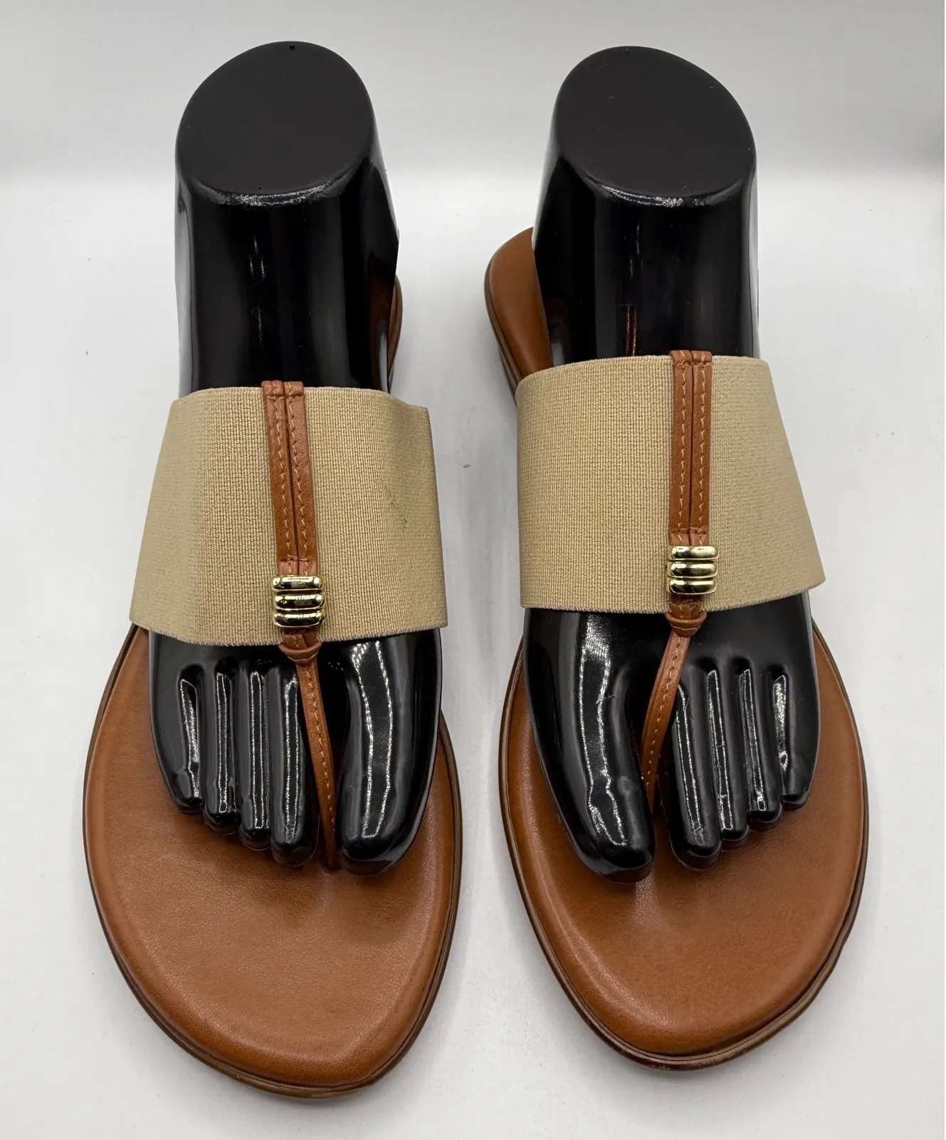 Women's brown leather thong sandals with a tan fabric band and gold accent detail. These stylish sandals feature a comfortable thong strap design and a chic band across the vamp, perfect for casual outings or a beach vacation. Style: Thong Department: Women Upper Material: Linen Blend Heel Style: Flat Features: Straps, Cushioned, Comfort Closure: Slip On Pattern: Solid Accents: Medallion Heel Height: Flat (Under 1 in) Type: Sandal Insole Material: Faux Leather Outsole Material: Faux Leather Lining Material: Fabric Occasion: Casual Condition:Good; Thrashes; Stain Keywords: brown sandals, leather sandals, thong sandals, tan sandals, gold accent, women's sandals, casual sandals, summer shoes, beach sandals, everyday sandals, chic sandals