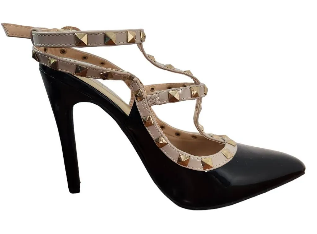 It's OK black heels with ankle strap. Sexy heels feature an ankle buckle, stud accents, and pointy toes. Heel height shown in images. There is a worn area inside that cannot be seen on exterior, shown in images, Great condition! Size 8 Wide Women Make me an offer! 0723-SHRK