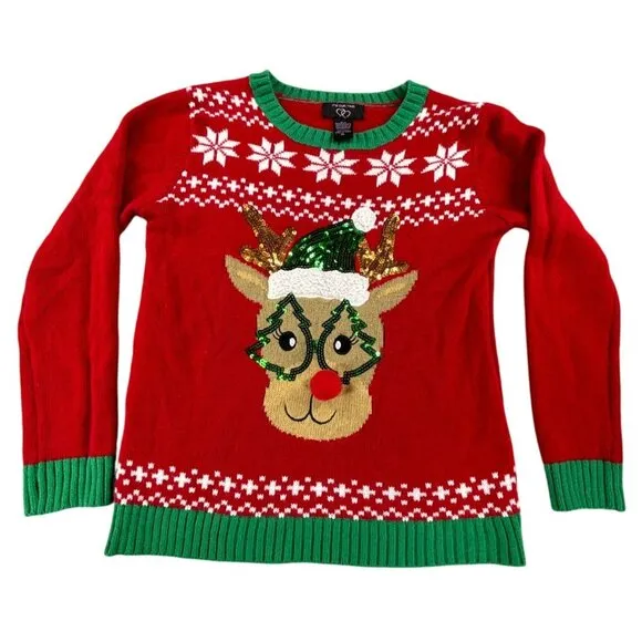 This sweater combines playful design with festive cheer, showcasing a reindeer with sequin embellishments. The acrylic fabric ensures warmth and durability, ideal for holiday gatherings. • Long sleeves • Reindeer design with sequins • Green ribbed cuffs and hem • 100% acrylic • Crew neckline Top to bottom = 22 inches Shoulder to shoulder = 16 inches See pictures for additional details, flaws, and measurements (can be different than the tag due to shrinkage and wear). Clothing items are in are in used condition, unless stated otherwise. Hats are shipped in a box if they are structured and in a bag if they are non structured.