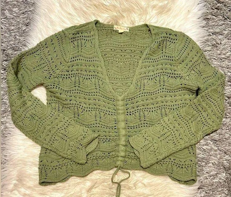 Size:M fit S Brand new This charming sage green knit tie-front top is a versatile addition to any wardrobe. The unique knit pattern adds a touch of texture and visual interest, while the tie-front detail allows for a customizable fit. Perfect for layering or wearing on its own, this top is ideal for transitioning between seasons. The lightweight and breathable knit fabric ensures comfort, making it a great choice for everyday wear. Sage green Knit top Tie-front Versatile Comfortable