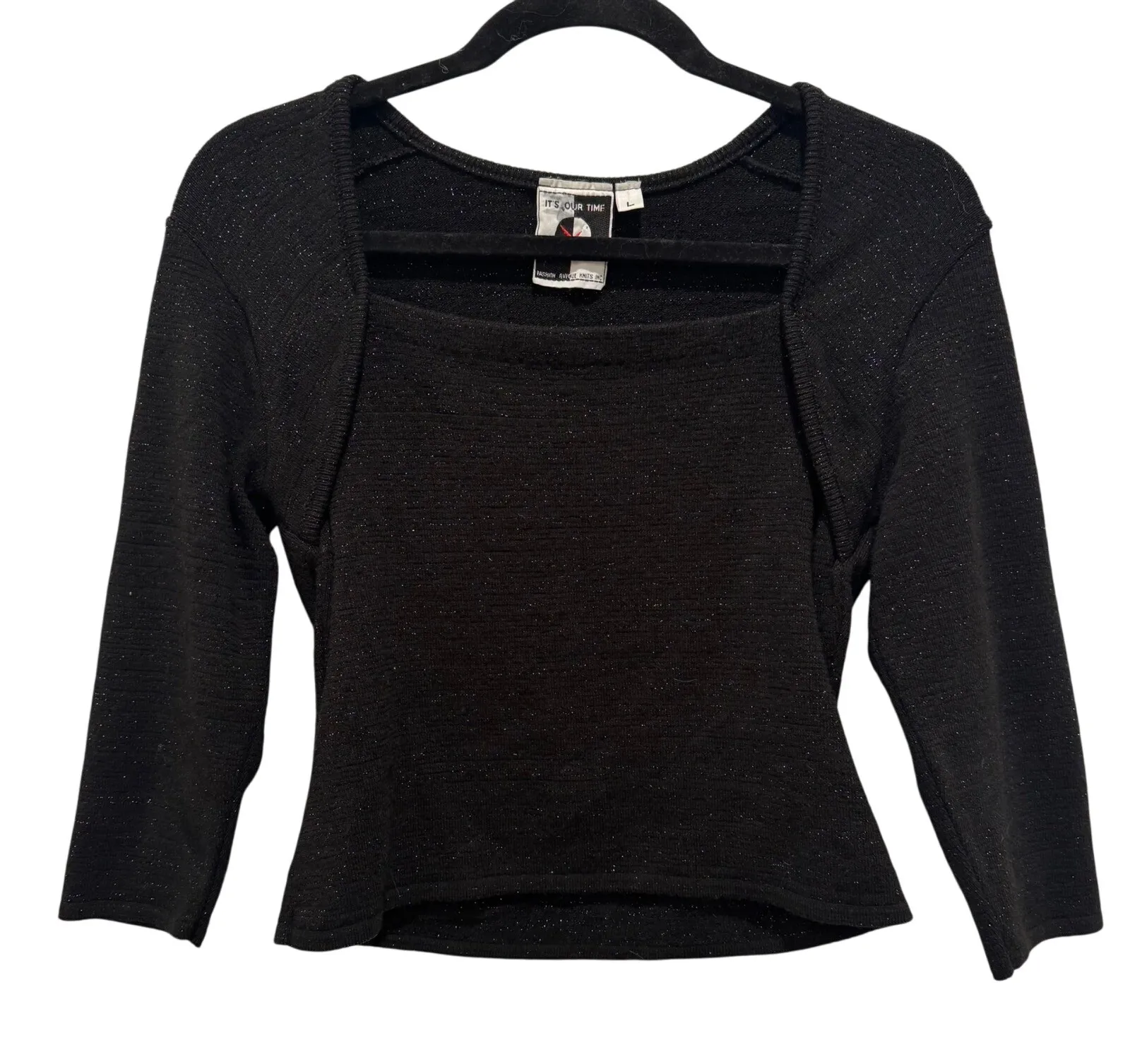 Embrace the allure of yesteryear with this vintage crop top, a timeless addition to any fashion lover's wardrobe. Featuring a flattering square neckline that frames the décolletage, the top is designed to accentuate your figure. The subtle metallic threading woven throughout the fabric catches the light with every movement, adding a touch of understated glamour. The 3/4 sleeves offer coverage while maintaining a modern silhouette, and the peplum style waist creates an hourglass illusion, making this a versatile piece that can be dressed up or down. Wear it to a retro-themed party, a chic cocktail event, or simply to add a vintage flair to your everyday ensemble. Vintage size L- however due to measurements I listed this item under Small. Measurements: • Pit to pit: 15 inches • Length from shoulder: 17 inches • Sleeve length: 16 inches Color: Black Type: Blouse Department: Women Style: Cropped Material: Acrylic, Nylon, Metallic, Spandex Neckline: Square Neck Sleeve Length: 3/4 Sleeve Sleeve Type: Classic/Fitted Sleeve Accents: Glitter Pattern: Solid Features: Metallic Threading, Square Neck, Crop Top, Peplum Waist, 3/4 Sleeves Fit: Slim Keywords: vintage crop top, square neck top, metallic threading, retro top, 90s top, black crop top, womens top, 3/4 sleeve top, peplum top, party top, cocktail top, It's Our Time top, Fashion Avenue Knits
