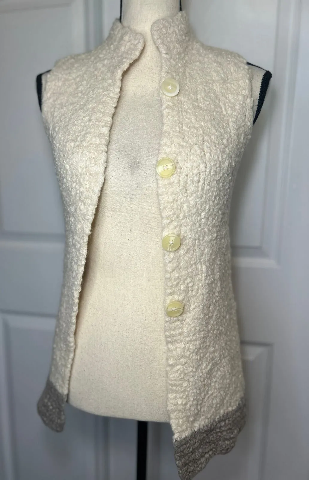 Chic boucle knit vest, an eye-catching layering piece that offers both style and warmth. Featuring a sophisticated stand-up collar and button-up front, this sleeveless cardigan design allows for versatile styling and easy wear. Gray stripe along bottom hem. Hole in gray knitting as shown. Can be repaired fairly easily. No tags. Sized using measurements. Approx 27"Long, 15" Across pit to pit across back Type: Vest Theme: Bohemian, Casual Fabric Type: Knit Features: Collared, Lined Accents: Button Keywords: boucle vest, knit vest, sleeveless cardigan, button up vest, ivory vest, cream vest, sweater vest, womens vest, ladies vest, casual vest, boho vest, bohemian vest, fall vest, winter vest