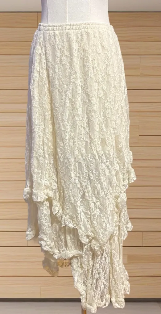 Romantic vintage-inspired ivory lace maxi skirt with dreamy boho and cottagecore vibes . Features a soft elastic waistband for a comfortable, flexible fit and a beautifully layered lace overlay with cascading ruffle tiers and an asymmetrical hem for added movement and texture. This skirt has a lightweight partial lining for coverage while still showcasing the intricate lace detail—perfect for prairie, Victorian, romantic bohemian, or festival styling. Easy to dress up or down with boots, blouses, knits, or flowy tops. Details: • Color: Ivory / cream • Elastic waistband • Tiered ruffle lace overlay • Partial lining • Maxi length, asymmetrical hem • Unlined lace sections for airy drape • Boho / cottagecore / prairie aesthetic Measurements (laid flat): • Waist (unstretched): 14” • Waist (stretched): up to 21” • Length (longest point): 38” • Lining length: 14” boho maxi skirt, lace prairie skirt, cottagecore clothing, vintage inspired skirt, romantic lace, festival outfit, Victorian boho, prairie chic, fairycore, soft goth, whimsigoth, western lace, western glam, soft girl,