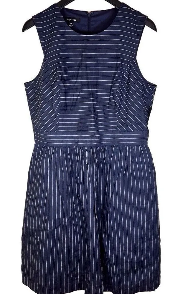 Ivy + Blu Womens Linen Pinstripe Knee Length Dress Blue White Size 10 Career A-Line Gently Used. No... Show more