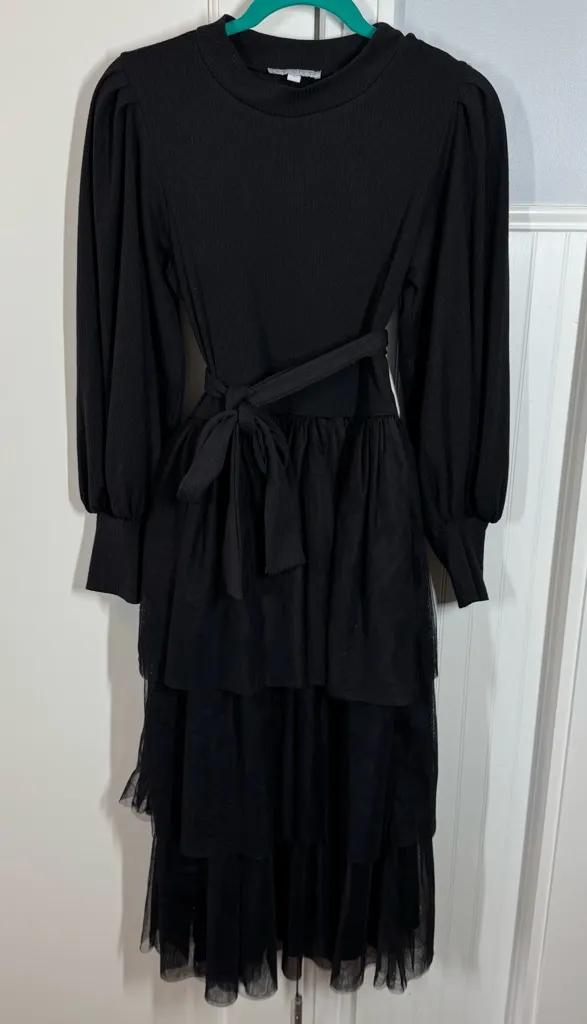 Size small 46” length Fabric above zipper has separated a little above zipper start It's the perfect combination of soft ribbed knit top with layers & layers of romantic tulle. It's pretty & elegant while keeping you warmer on chilly winter days & nights. - Material: 5% Spandex, 95% Polyester - Comfortable fit with some stretch in the soft knit material - Hidden Side Zipper - Fully lined skirt portion - Billowed bishop sleeves - Mock neck - Optional/Detachable waist tie - Triple layers of tulle Size Small in Ivy City is a 4-6. With the spandex stretch in this bodice it comfortably leans towards the 6 size. Check measurements to see what works for you. winter, fairycore, special occasion, whimsical, elegant, romantic, dark balletcore Cocktail formal, prom, homecoming, school dance, winterfest, party sexy night out going out sorority y2k 90s graduation club girls night practical magic friends rachel green phoebe buffet Monica Geller bratz bachelorette cottagecore wedding guest mother of the bride gala church
