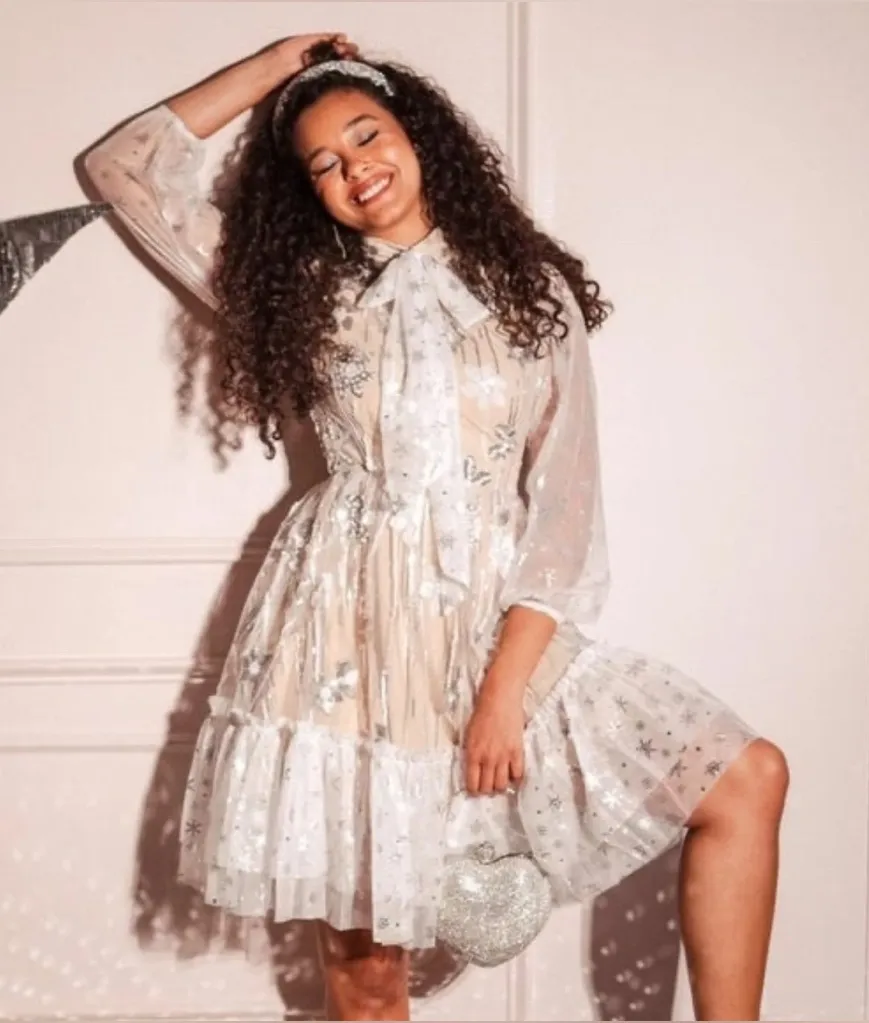 Charming sheer dress adorned with star patterns and a bow. Ideal for special events. Brand new with tags Size S Get your sparkle back with our Ellis Dress in Silver Sequin. The knee-length design and long slight puff sleeves add a touch of elegance to this stunning occasion dress. Featuring a beautiful bow at the neck and statement-making sequin snowflakes throughout. The perfect party dress!
