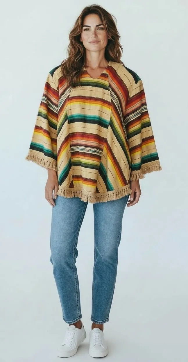 New with tags Machine wash Main 100% cotton Combo 100% rayon Lined neckline tassel fringe hem keyhole back closure Colors may vary by device. Measurements: Approximate and taken while hanging. Pit to pit 19.5 inches Length 22/23 inches AI model may be used to illustrate possible fit and look. Pictures of the actual item immediately follow ivy jane womens large l serape striped fringe blouse boho western southwestern cowgirl festival hippie bohemian boutique rustic tribal folk artisan colorful statement top fringe Ar1303
