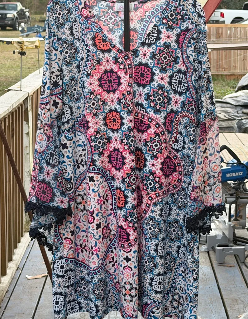 Vibrant bohemian dress with intricate patterns. Features a mix of pink, blue, and black colors. Perfect for a stylish look. The image displays a colorful, long-sleeved tunic dress with an intricate, vibrant pattern. Colors: The primary colors include white, black, various shades of blue (teal, turquoise, navy), hot pink, and orange. Pattern: The design features a bohemian or global-inspired mosaic/tile pattern with floral and geometric motifs. Style: It has a V-neckline and a loose, flowy fit. Details: The sleeves and the bottom hem feature a delicate navy lace trim. Ivy Lane tunic dress size XL in excellent condition
