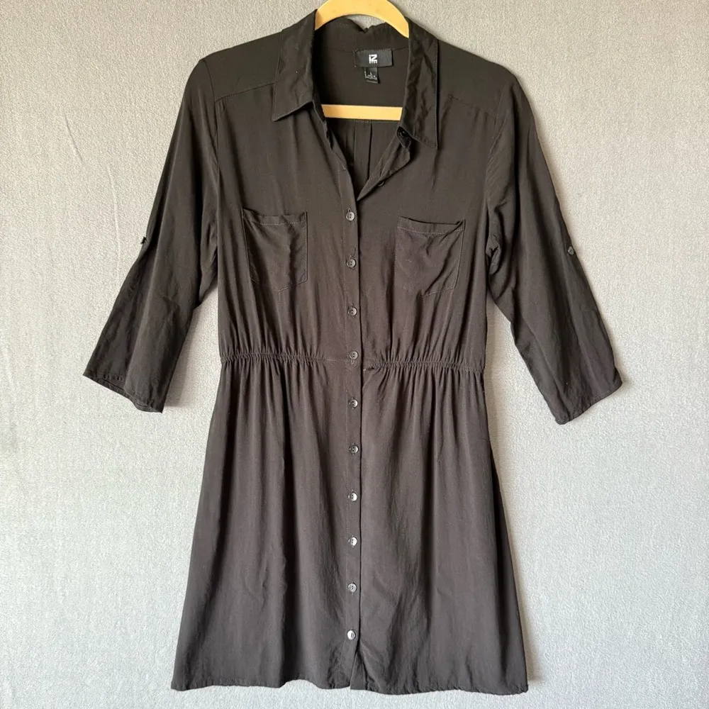 Black but not shirt dress by IZBYER size large made in the Philippines 100% rayon 3/4 sleeves roll u... Show more