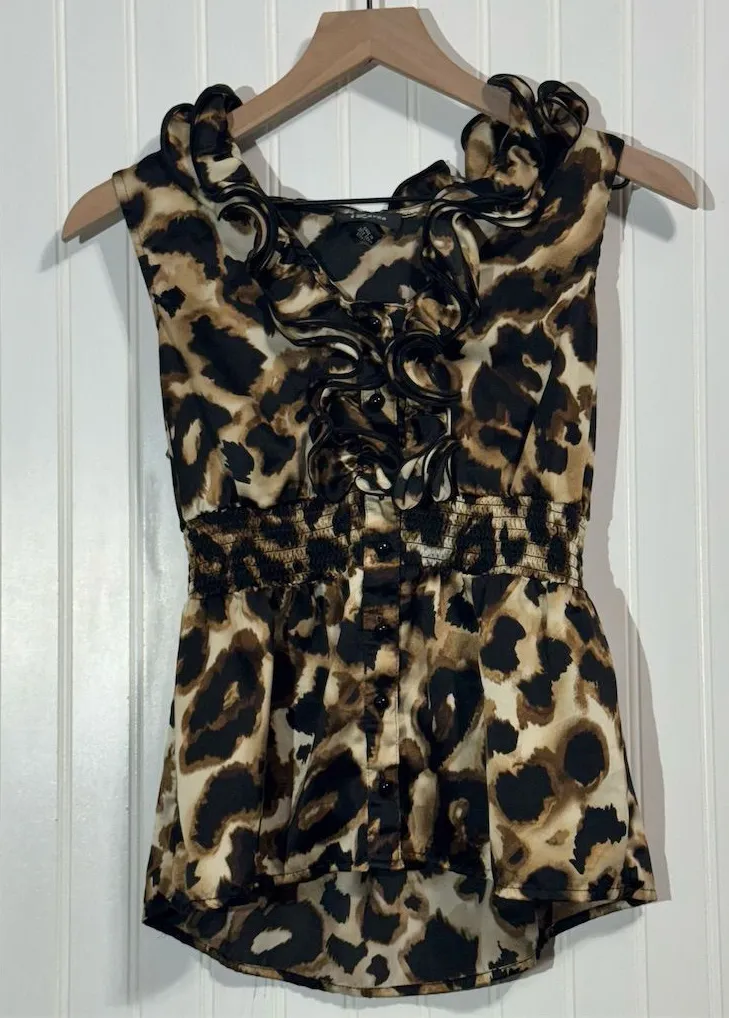 Turn heads with this IZ Byer leopard print sleeveless blouse in size Medium. Features a dramatic ruf... Show more
