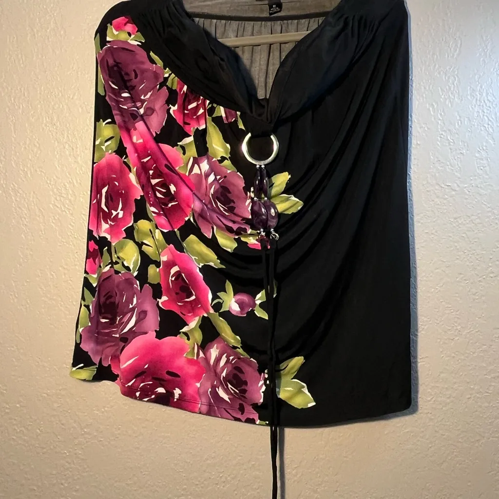 Chic black top featuring bold purple floral patterns. Accentuated with a stylish Necklace detail at... Show more
