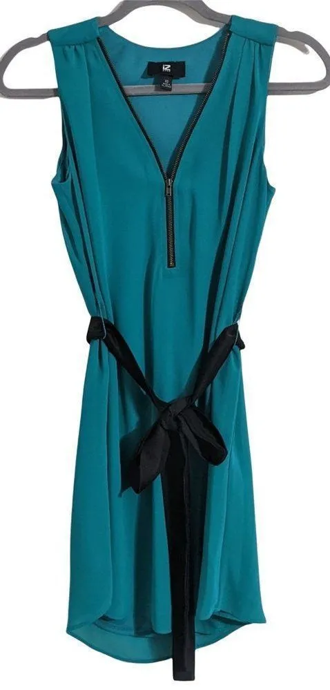 Iz Byer mini dress. Zip front dress features pull-on style and tie at waistline. Fabric is turquoise... Show more