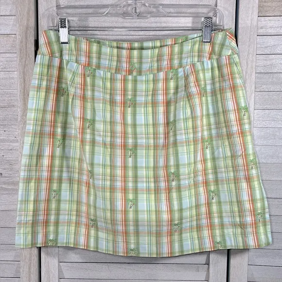 Gently used, no stains or rips. Plaid skort in green, blue, orange with embroidered palm trees. Side zip closure, one zippered pocket on the right side, stretchy attached shorts underneath. Skirt has two side slits. Waist measures 15.5" across and length of skirt is 17", attached shorts have 4.5" inseam.
