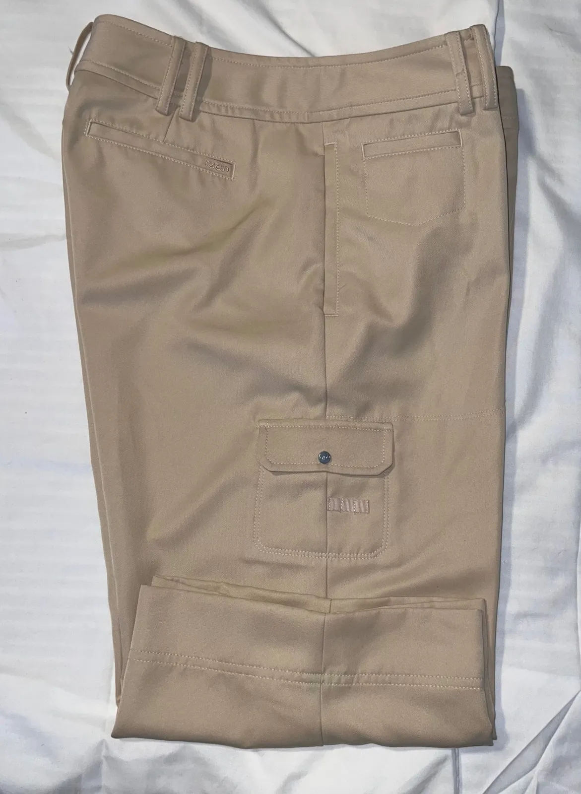 EUC 100% Polyester Machine washable Flat waist 30" Inseam 14" Style: Capri Color: Beige Department: Women Type: Pants Material: Spandex, Polyester, Cotton Blend Leg Style: Straight Fabric Type: Twill Features: Stretch, Crop, Cuffed, Easy Care, Comfort Pattern: Solid Closure: Button, Zip Accents: Button Occasion: Casual, Travel Keywords: capri pants, cropped pants, cargo pants, womens pants, beige pants, khaki pants, stretch pants, casual pants, womens capris, cropped trousers, cargo capris, summer pants, spring pants, lightweight pants