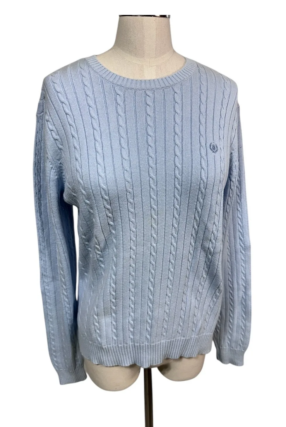 Description: Light blue 100% cotton cable knit sweater by Izod. Features a crew neckline, ribbed tri... Show more