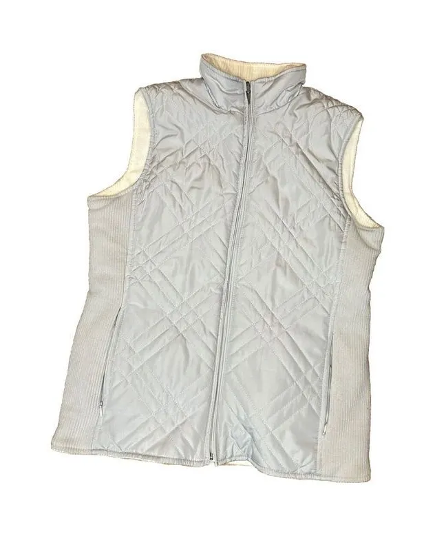 This versatile Izod puffer vest is perfect for layering during fall, winter, or spring. With a reversible design, you can switch up your look easily. The vest features a zip-up closure, sleeveless style, and a slim fit. The cream and white color adds a touch of elegance, making it ideal for both casual and outdoor occasions. Made from fleece fabric, this vest provides warmth and cozy comfort, and the polyester lining material ensures durability. The accents include a zipper, and the garment care is easy, as it is machine washable. This vest is available in size S, and it falls to hip length. Enjoy the functionality of this vest without worrying about the condition, and stay stylish and comfortable throughout the day.