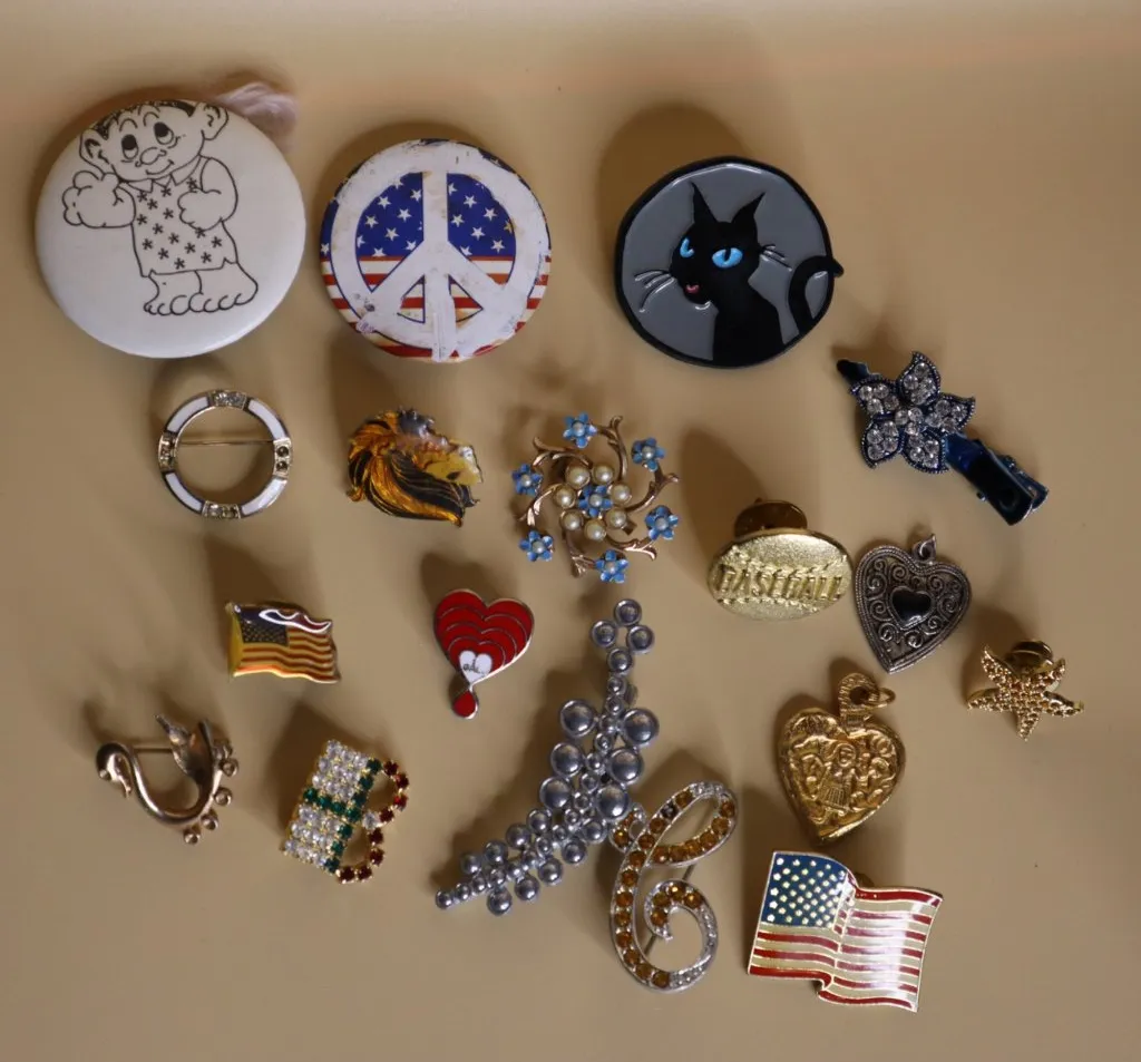 This is a collection of vintage enamel and rhinestone brooches and pins featuring various designs including an American flag peace sign, an American flag, a black cat, floral patterns, and a heart.
