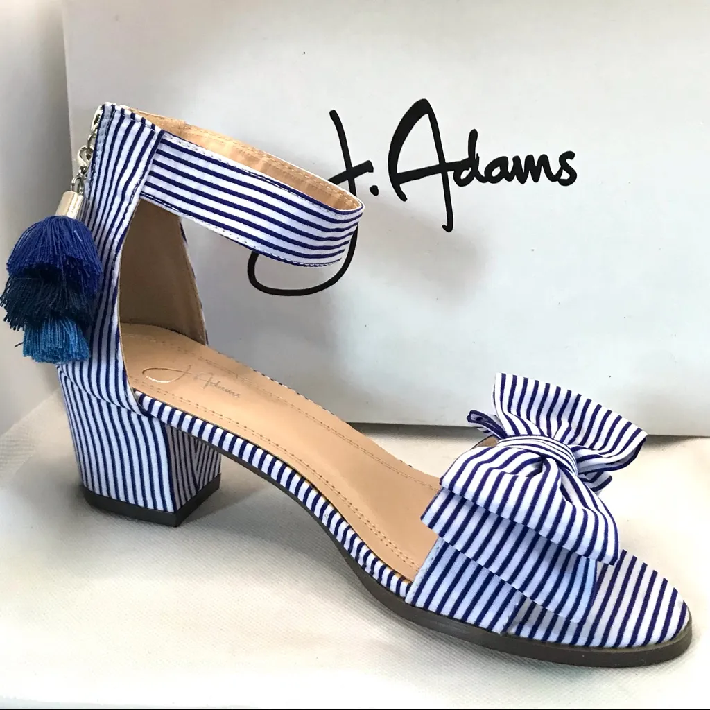 This listing is for the shoes pictured. J. Adams -blue and white -pin stripes -style "April" -bow toe -low profile block heel -back zipper closure -pom pom accents at back -fabric upper -synthetic soles Shoes are a size 7M (2IN heel) -additional measurements are provided in photos. Shoes are NIB