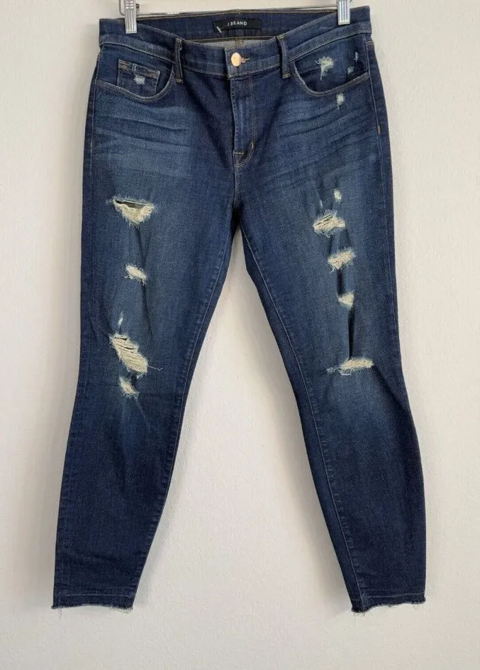 These J Brand cropped jeans for women feature a mid-rise, distressed dark wash design in a blue deni... Show more
