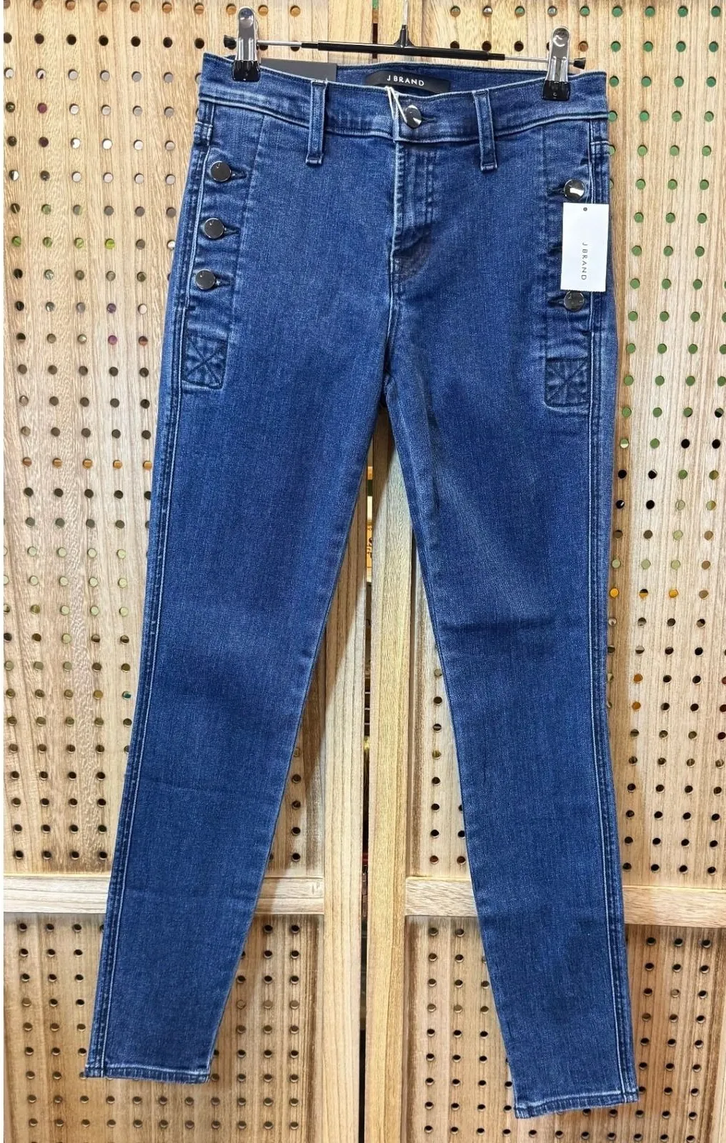 Stylish women's jeans from J Brand, featuring a slim-fitting, skinny ankle silhouette and a classic blue denim wash. These jeans have a unique design element of button accents along the sides, adding a touch of distinction to the traditional denim look. The jeans showcase a refined style with a versatile aesthetic.