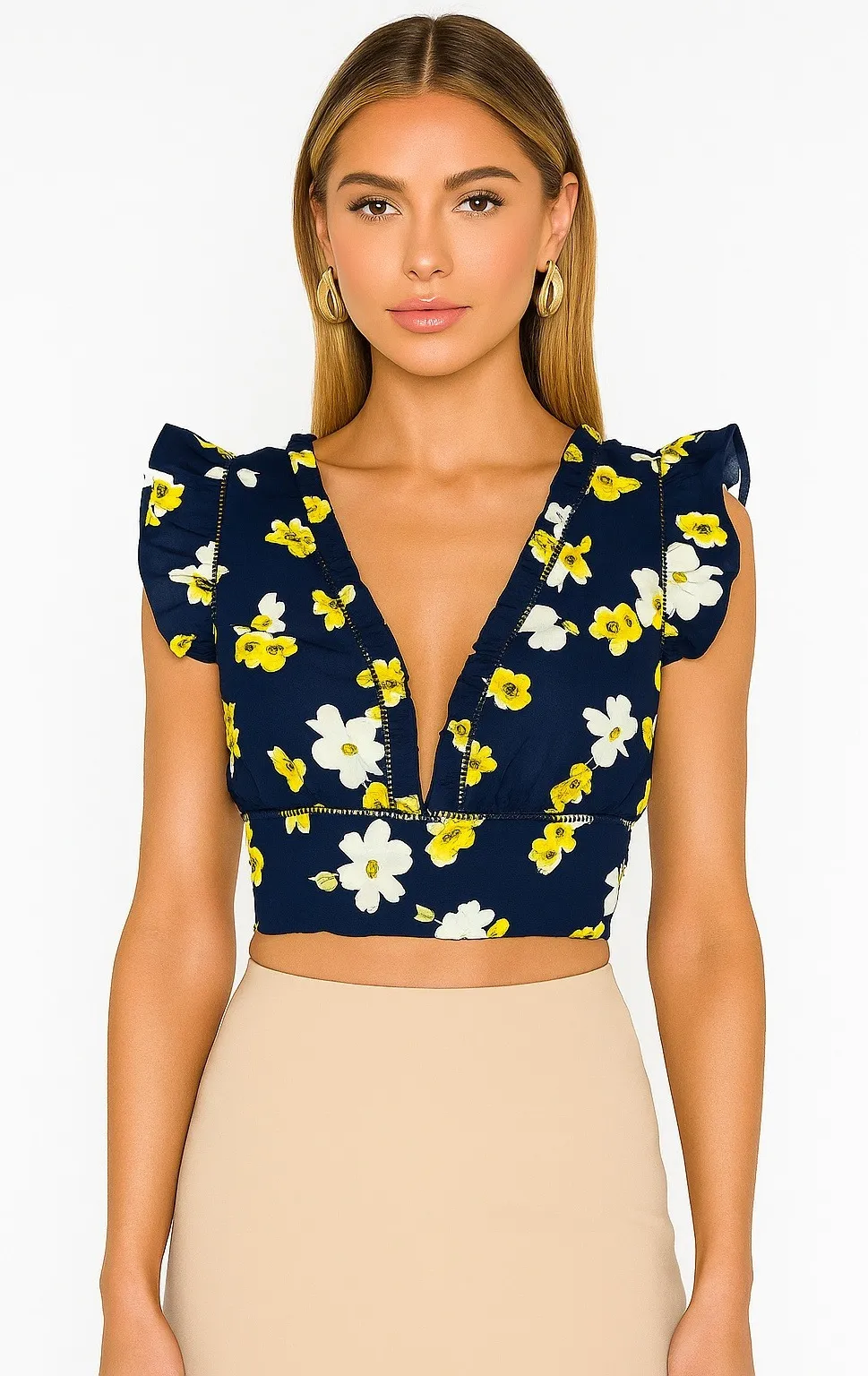 J by JOA Navy Blue Floral Print Ruffle Trim Crop Top Women's - great condition, see all pictures! Measurements Laying Flat!! Size - S Armpit to Armpit • 18 Length • 15" Navy blue crop top by J by JOA adorned with a charming yellow and white floral print. This piece features a plunging V-neckline with delicate ruffle trim and eyelet detailing along the edges. Flutter sleeves add a feminine touch, and the open back with a tie closure creates a flattering silhouette. Perfect for brunch with friends or a casual summer outing. Keywords: J by JOA, floral crop top, ruffle sleeves, plunge neck, eyelet trim, tie back, summer top, boho, feminine, casual, brunch wear, vacation *All Items have been cleaned/ steamed. 1225-C