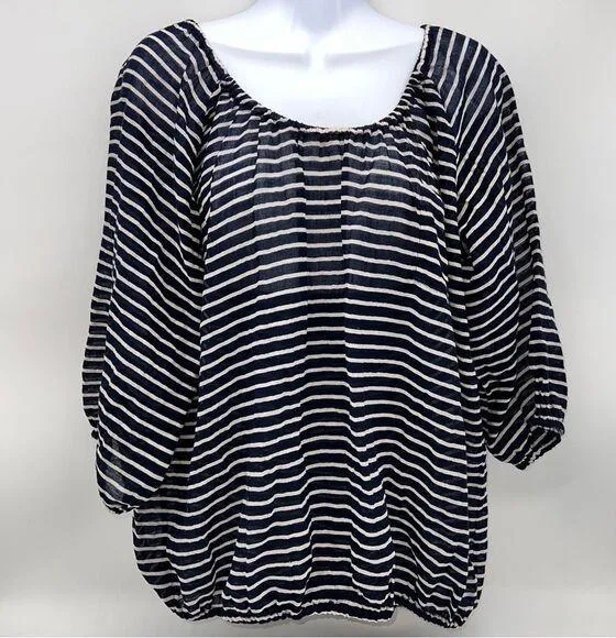 GUC J. Crew Factory Sheer Navy and White Wide Neck Top w/Pocket on the Chest-Size S. Elastic at the waist. 3/4 length sleeves. Loose fit. Some minor thread pulls. See the last 2 pictures. 100% Cotton Measurements: Bust- 52" Waist- 36" Length- 25"