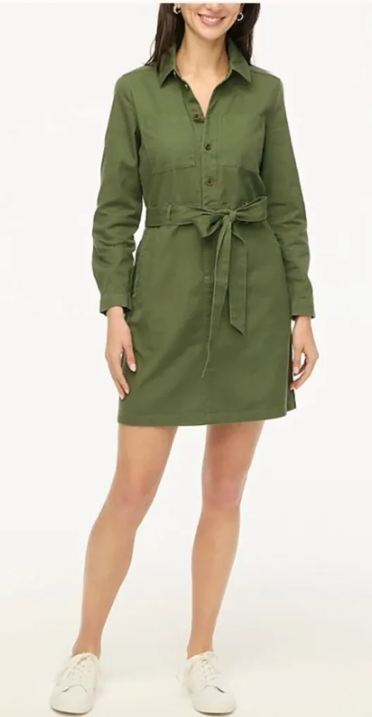 Army olive green color Belt is included, just forgot it when taking pictures Pockets collared zipper and button front. Long sleeves 100% Cotton Preowned condition, no flaws Armpit to armpit: 22 Waist: 36 (waist is stretchy) Length: 37 J Crew J.Crew JCrew