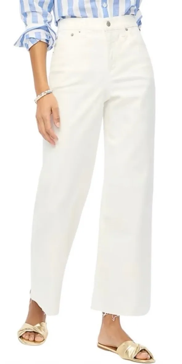 Features: J. Crew Factory Wide-leg Cropped Jeans in White All-Day Stretch; Sits above waist, slim at the hip, easy at the thigh, with a slim wide-leg. Zip fly, traditional 5-pocket styling, 98% cotton/2% elastane Size: 26 Condition: New with tags (some tags marked through to prevent store return) There are two small stains on the bottom/back by the hem - please refer to all pictures gifts for her, casual, chic, relaxed, stylish, trendy, feminine, bohemian, boho, minimalist, basics, staple, spring, summer, denim, cotton