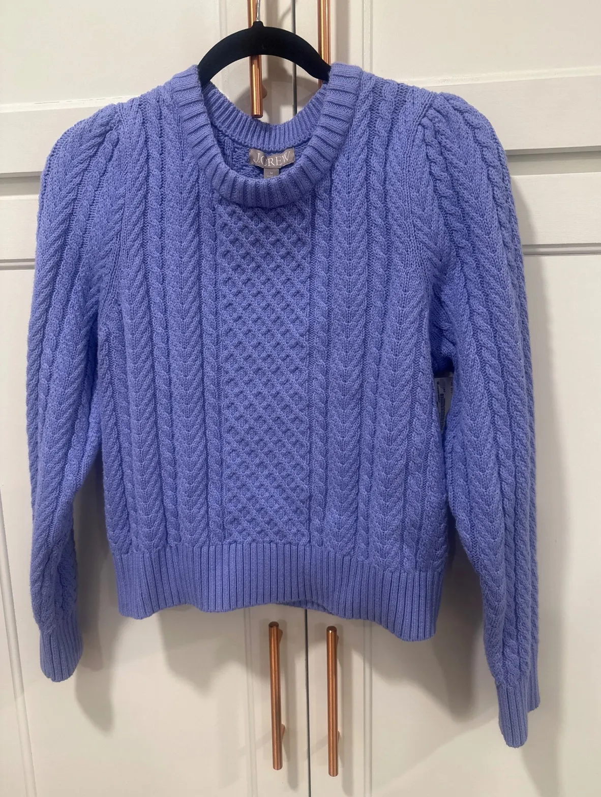 Wrap yourself in cozy charm with this J.Crew lavender sweater. Intricate cable knit detailing creates a beautiful textured pattern across the bodice and sleeves, while subtle puff sleeves add a touch of feminine flair. The classic crew neckline and ribbed cuffs and hem provide a comfortable and flattering fit. Perfect for a casual day out, a cozy evening at home, or adding a pop of color to your work wardrobe. Style: Pullover Department: Women Material: Wool Neckline: Crew Neck Sleeve Length: Long Sleeve Type: Sweater Features: Shoulder Pads Pattern: Solid Sleeve Type: Puff Sleeve Fabric Type: Knit Knit Style: Cable-Knit Season: Fall, Winter Fit: Classic Occasion: Casual Country of Origin: China Unit Type: Unit Keywords: J Crew, lavender sweater, cable knit, puff sleeve, textured knit, crew neck, cozy, feminine, winter fashion, fall style, casual wear, workwear